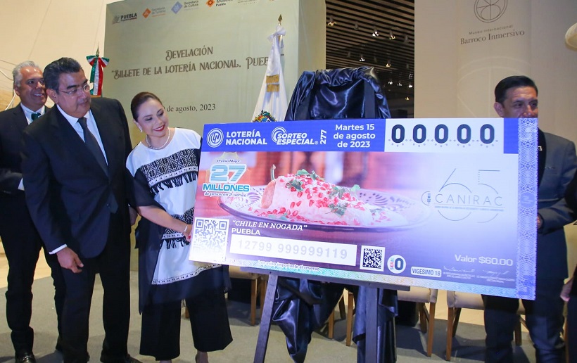 Dijo que, desde marzo de este año, la CANIRAC nacional comenzó con la emisión de “cachitos” de la Lotería Nacional. La selección de platillos está relacionada con la popularidad y la carga cultural. En Puebla se eligió al Chile en Nogada, muy peculiar y deseado, ya que su temporada sólo abarca de julio a septiembre: “hoy celebramos la emisión de este cachito de Lotería para un sorteo de 27 millones de pesos que será el martes 15 de agosto”, explicó.