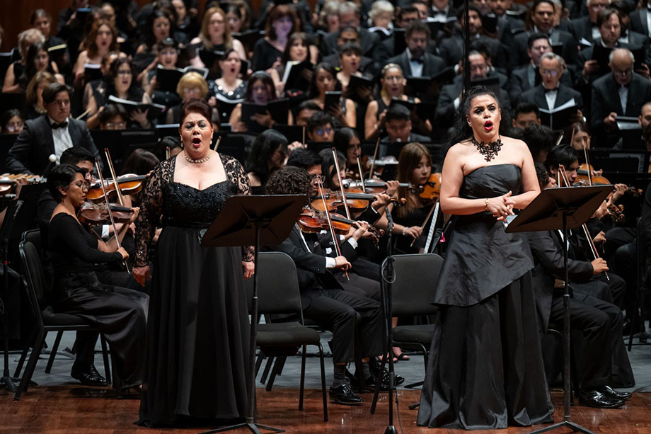 En escena, la soprano Bertha Granados, la mezzosoprano Belém Rodríguez, el tenor Alan Pingarrón y el bajo José Luis Reynoso dieron cuerpo a los momentos más íntimos y a los más desgarradores de la obra, pues sostenían un diálogo constante con la masa coral y la orquesta.